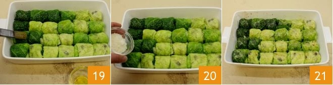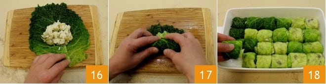 En este punto puedes proceder a la preparación de los rollitos: coloca en el centro de cada hoja de col una cucharada de arroz 16; con las manos enrolla delicadamente el rollito y luego ciérralo como un paquete 17: con estas cantidades deberás obtener 12 rollitos de col. Si quieres hacer rollitos más pequeños puedes dividir las hojas a la mitad en el sentido longitudinal con un cuchillo y luego rellenarlas, obteniendo así 24 porciones. Aceita una fuente de horno de 20x30 cm y coloca los rollitos uno al lado del otro con la parte doblada hacia abajo 18.