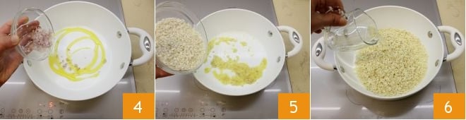 En una cacerola antiadherente, sofríe a fuego medio el aceite y la chalota picada 4, después añade el arroz 5. Tuesta el arroz durante 2-3 minutos y luego desglasa con el vino blanco 6.