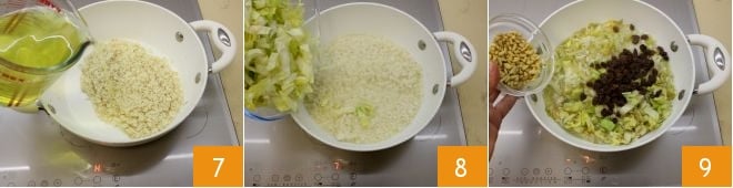 Cocina a fuego medio durante 20 minutos, agregando uno o dos cucharones de caldo vegetal filtrado cada vez que el anterior se haya evaporado 7; mezcla bien con la espátula y, 5 minutos antes de que termine la cocción, añade la escarola cortada en tiras 8. Escurre bien las pasas con un colador de malla fina y luego únelas al arroz junto con los piñones 9.