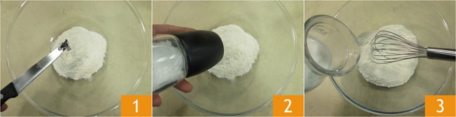 Para preparar el kaiserschmarren, comienza vertiendo en un bol la harina, las semillas de una vaina de vainilla 1, una pizca de sal 2 y la leche en hilo, mezclando con un batidor 3.