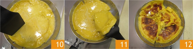 Cuando la base esté cocida y dorada, puedes dividirla en 4 partes 10 11, para girarlas más fácilmente y cocinarlas por el otro lado 12.