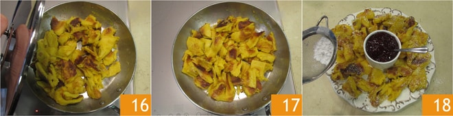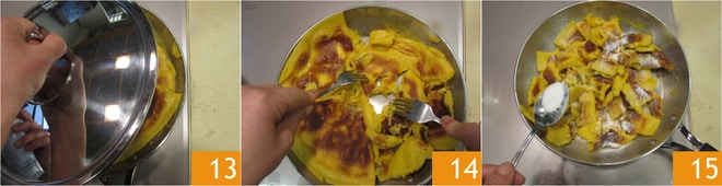 Cocina durante otros 2-3 minutos, siempre con tapa 13. Pasado este tiempo, puedes quitar la tapa y "romper" con la ayuda de dos tenedores para reducir el kaiserschmarren en trozos gruesos e irregulares 14. Deja saltear sin tapa por unos instantes más, luego espolvorea con una cuchara de azúcar granulada 15, para caramelizar.
