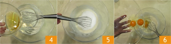 Cuando hayas incorporado la leche, añade el ron 4, luego el azúcar 5, y finalmente los huevos 6 y continúa mezclando la mezcla con un batidor manual.