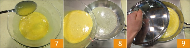 La masa deberá quedar homogénea, será bastante líquida 7: asegúrate de que no haya grumos. Toma una sartén de acero y derrite completamente la mantequilla a fuego lento. Vierte la mezcla en la sartén 8 y cocina durante unos 3-4 minutos a fuego medio-alto, cubriendo con una tapa 9.