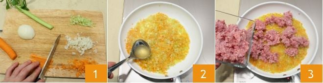 Para preparar las lasañas coloridas, empieza con el ragú: prepara el picado de cebolla, apio, zanahoria 1 y sofríelo a fuego lento durante unos minutos, alargando con Caldo de verduras 2. Cuando las verduras estén pochadas, añade la carne picada 3, mezcla y sala y pimienta al gusto; cocina el ragú blanco durante al menos 30 minutos.