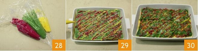 Vierte las bechameles coloridas sobrantes en las mangas pasteleras 28 y crea motivos decorativos coloridos 29. Puedes cocinar las lasañas coloridas en un horno estático precalentado a 180°C durante 40 minutos (o en un horno con ventilación a 160°C durante 30 minutos). Saca las lasañas coloridas del horno 30 y sírvelas bien calientes!