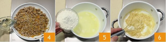 A mitad de cocción, puedes rociar la carne con el vino blanco 4; cuando el ragú esté listo, apaga el fuego y resérvalo. Mientras tanto, prepara la Bechamel: en una cacerola vierte la mantequilla y déjala derretir, luego añade la harina tamizada en forma de lluvia 5, mezcla con un batidor para que no se formen grumos 6.