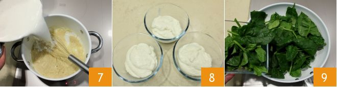 Añade poco a poco la leche previamente calentada 7 y sigue mezclando para espesar la mezcla a fuego lento; puedes aromatizar con nuez moscada rallada y añadir una pizca de sal. Cuando la bechamel haya alcanzado una consistencia cremosa, apaga el fuego y divídela en tres cuencos 8 (cúbrelos con papel film en contacto para que no forme una costra en la superficie). En una sartén aparte, vierte un poco de aceite y el ajo machacado, luego cocina las espinacas previamente lavadas 9.