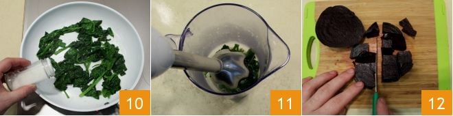 Bastarán unos pocos minutos para que se ablanden, entonces sala 10 y pimienta al gusto antes de apagar el fuego. Tritura las espinacas cocidas 11 y resérvalas. Procede con la limpieza de las remolachas: córtalas en cubos 12