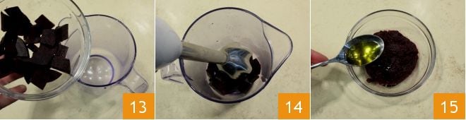 y tritúralas (13-14), luego condimenta con una cucharadita de aceite 15 y sal al gusto.