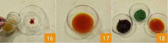 Por último, en un cuenco disuelve el azafrán en polvo con un poco de caldo vegetal (16-17). Ahora tienes listas todas las preparaciones 18.