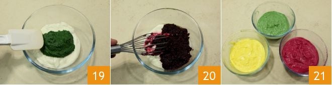 Condimenta los cuencos de bechamel con las diferentes cremas, de espinacas 19, de remolacha 20 y de azafrán, para tener así tres bechameles de diferente color y sabor 21.