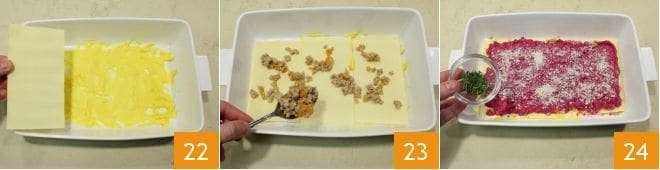En este punto, toma una bandeja rectangular de 20x30 cm, vierte en el fondo un poco de aceite y crema de azafrán. Coloca las láminas de pasta al huevo 22, una capa de ragú 23 y una de crema de remolacha; espolvorea con Parmesano rallado y tomillo picado 24.