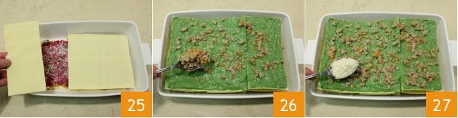 Continúa con otra capa de lámina 25, luego alterna las capas con ragú, Parmesano, las otras dos cremas coloridas y el tomillo hasta terminar los ingredientes (puedes finalizar con la bechamel de espinacas). Luego extiende el ragú restante 26 y espolvorea con el Parmesano 27.