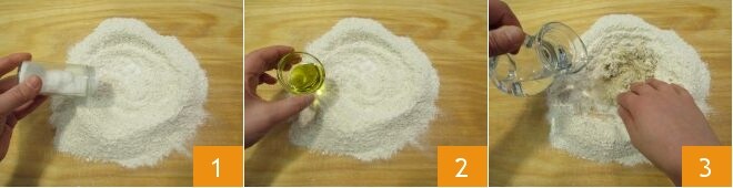 Para preparar las lasañas veganas, empieza a realizar la masa de la pasta. Coloca en una superficie la harina integral, intentando darle forma de volcán. Agrega una pizca de sal 1, el aceite 2, y comienza a amasar vertiendo el agua en hilo 3.