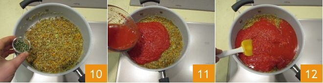 Añade también el romero picado 10, el puré de tomate 11, el agua y mezcla todo 12.