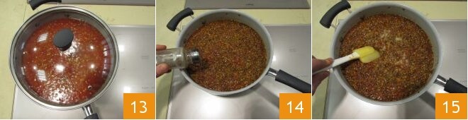 Cubre con una tapa 13 y deja cocinar durante 60 minutos. Solo cuando las lentejas estén cocidas, podrás salar y pimentar todo 14; mezcla nuevamente 15 y el ragú de lentejas estará listo.