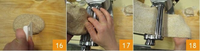 Tan pronto como la pasta haya reposado, retoma la masa y divídela en varios trozos utilizando una tarjeta de masa 16. Utilizando una máquina de pasta, estira la masa desde el grosor más ancho 17 hasta el penúltimo 18, para obtener una lámina de aproximadamente 3-4 mm de grosor. Alternativamente, puedes usar un rodillo.