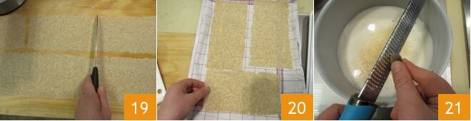 Coloca la masa en la superficie ligeramente enharinada y luego córtala para obtener rectángulos del tamaño adecuado para la bandeja. En nuestro caso, los rectángulos de pasta tenían un tamaño de 16x12 cm 19. Una vez obtengas los rectángulos, colócalos en las bandejas donde habrás colocado paños limpios 20. Deja secar ligeramente la pasta y mientras tanto, ocúpate de preparar la bechamel. Vierte la leche de arroz en una cacerola, añade la nuez moscada 21 y llévala a casi hervir.