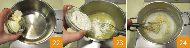 En otra cacerola, añade la margarina 22 y déjala derretir suavemente. Cuando esté completamente derretida, añade la harina en forma de lluvia 23 y mezcla rápidamente para obtener una mezcla sin grumos. Déjala dorar suavemente, luego vierte la leche caliente poco a poco 24.