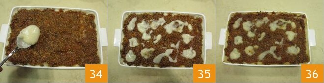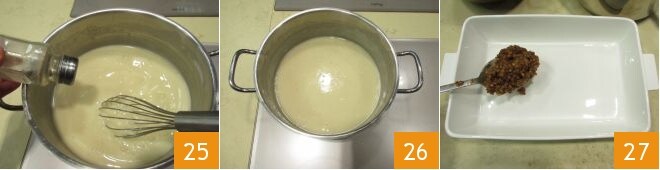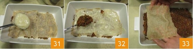 Añade también una capa de bechamel 31 y cubre con más ragú 32. Continúa de esta manera, hasta terminar la pasta 33.