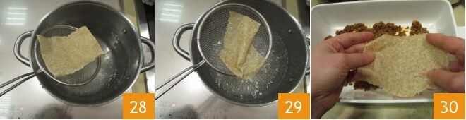 Tan pronto como el agua comience a hervir, sumerge cada rectángulo de pasta 28 y cocínalo durante aproximadamente 1 minuto. Utilizando una espumadera, escúrrelo bien del agua de cocción 29 y colócalo sobre el ragú 30. Continúa de esta manera hasta cubrir toda la superficie.