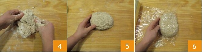 Continúa trabajando la mezcla 4 hasta obtener una masa lisa y homogénea 5. En este punto, envuélvela en film 6 y déjala reposar durante una hora a temperatura ambiente.