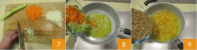 Mientras tanto, ocúpate de preparar el ragú de lentejas. Lava y pica finamente las zanahorias, el apio y la cebolla 7; en este punto, viértelos en una cacerola junto con el aceite 8 y déjalos dorar a fuego moderado durante unos diez minutos. Cuando estén bien dorados, añade las lentejas secas previamente enjuagadas 9.