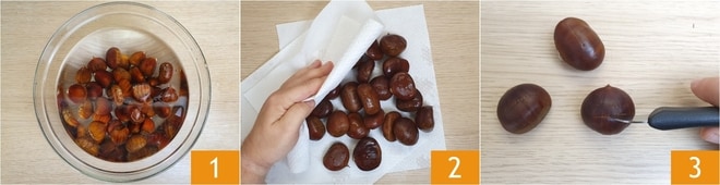 Para realizar la mermelada de castañas, primero eliminad las que estén agujereadas o dañadas. Colocad las castañas en un bol, cubridlas con agua y dejadlas en remojo durante 30 minutos 1. Pasado este tiempo, enjuagad las castañas y secadlas 2, luego haced un corte horizontal de un par de centímetros en la parte abombada de la cáscara 3.