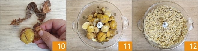 En este punto, tomad una castaña a la vez del paño y retirad tanto la cáscara como la piel 10. Transferid 660 g de castañas peladas a un procesador de alimentos 11 y triturad 12; alternativamente, podéis usar un pasapurés.