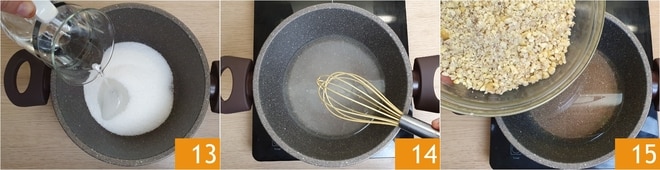 En un cazo, verted el azúcar y el agua 13 y llevad a ebullición mezclando con una varilla 14. Cuando el azúcar se haya disuelto, agregad las castañas trituradas 15.