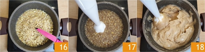 Añadid también las semillas de una vaina de vainilla 16 y coced durante 10 minutos a fuego moderado, mezclando constantemente con la varilla para evitar que el puré se pegue al fondo. Finalmente, triturad todo con una batidora de inmersión 17 hasta obtener una mezcla cremosa y aterciopelada 18.