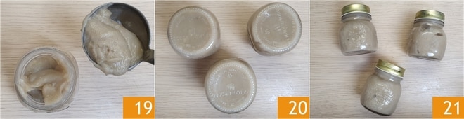 Verted la mermelada aún caliente en los tarros que habréis esterilizado previamente 19, cerradlos con la tapa y volvedlos 20. Cuando se hayan enfriado completamente, verificad que se haya formado el vacío presionando la tapa en el centro. ¡Vuestra mermelada de castañas está lista para ser degustada 21!