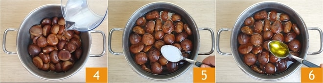 Transferid las castañas cortadas a una olla y cubridlas con agua fría 4, agregad la sal gruesa 5 y el aceite 6.