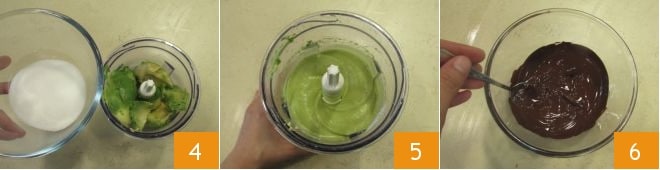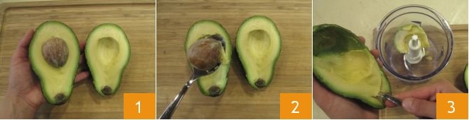 Para preparar la mousse de chocolate y aguacate, primero cortad el aguacate por la mitad 1 y quitad el hueso con la ayuda de una cuchara 2, luego extraed la pulpa (obtendréis unos 240 g) y ponedla dentro de una batidora 3.