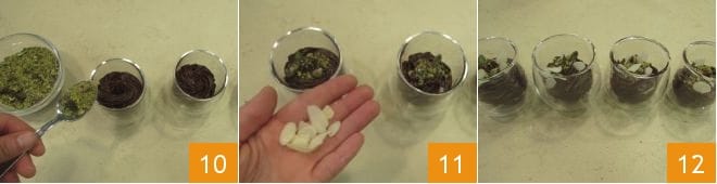 Pasado el tiempo de reposo, llenad 4 vasitos de aproximadamente 100 g cada uno con la mezcla de chocolate y aguacate, luego decorad con el granillo de pistachos 10 y las almendras fileteadas 11: vuestra mousse de chocolate y aguacate está lista para ser servida 12.