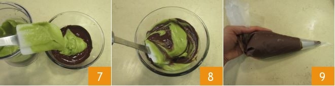 Incorporad la crema de aguacate al chocolate fundido 7 y mezclad bien con una espátula para integrar todo 8, luego transferid la mezcla a una manga pastelera con boquilla estrellada 9 y dejad que cuaje en la nevera durante unos 15 minutos.