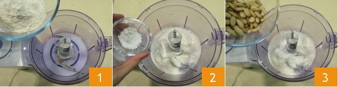 Para preparar los muffins 5 minutos, verted en el recipiente de un procesador de alimentos equipado con cuchillas la harina 00 1 y la levadura 2. Añadid también las almendras 3,