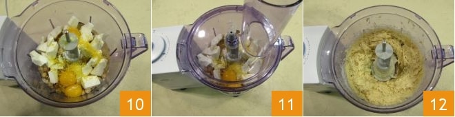 Una vez introducidos todos los ingredientes 10, cerrad el procesador 11 y triturad todo hasta obtener una mezcla cremosa, lisa y homogénea 12.