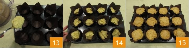 Colocad los moldes en una bandeja para muffins y, utilizando una cuchara, transferid la masa dentro, sin superar los 2/3 de la capacidad (13-14); deberéis distribuir aproximadamente 65 g de masa por cada molde. Coced en horno estático precalentado a 170° durante unos 25 minutos; haced siempre la prueba del palillo y una vez cocidos, sacadlos del horno 15 y disfrutad de vuestros muffins 5 minutos.