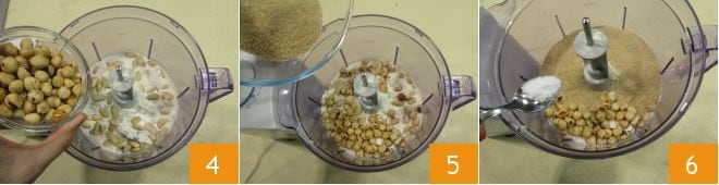 las avellanas peladas 4, el azúcar moreno 5 y la media cucharadita de sal 6.