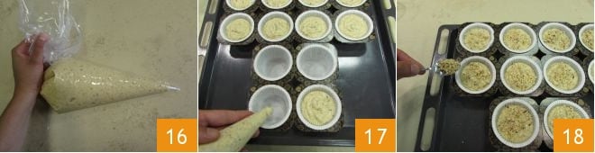 Transfiere la mezcla obtenida dentro de una manga pastelera 16 y utilízala para llenar 12 capacillos 17. Decora con el granillo de avellanas 18,