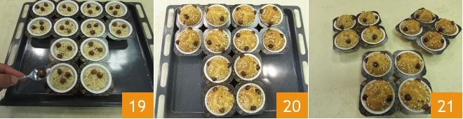 y con las avellanas enteras. Hornea los muffins en horno estático precalentado a 180° durante 35 minutos en la rejilla central. Luego retíralos del horno 20, deja que se templen y ¡sirve tus muffins de avellanas 21!
