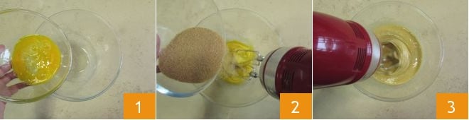 Para preparar los muffins de avellanas lo primero que debes hacer es verter los huevos en un bol 1. Comienza a batirlos con una batidora eléctrica y mientras tanto añade el azúcar moreno 2. Continúa batiéndolos hasta que estén esponjosos y espumosos 3.