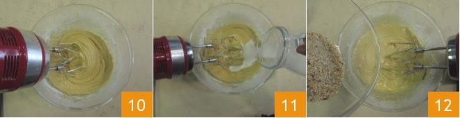 Cuando estén completamente absorbidos 10, vierte una parte de la leche 11, mezcla y añade la harina de avellanas 12.
