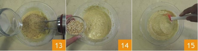 Vierte la leche restante 13 y mezcla nuevamente con las varillas. Luego añade el granillo de avellanas 14 y mezcla con una espátula 15.