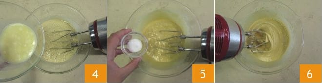 Luego vierte la mantequilla derretida 4, la sal 5 y mezcla nuevamente con las varillas 6.