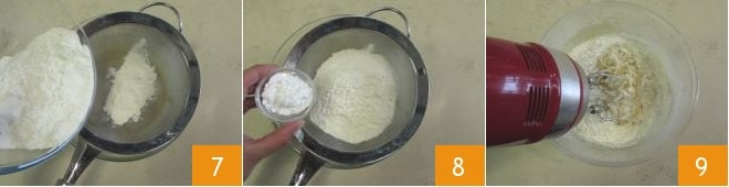 Tamiza directamente en el bol la harina 00 7 y la levadura 8. Incorpóralas al resto de los ingredientes siempre utilizando las varillas eléctricas 9.