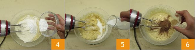 Una vez incorporada, añade la harina y la levadura 4. Luego vierte la leche en hilo 5 y las especias en polvo: canela, jengibre 6