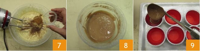 y el anís 7. Incorpora todos los ingredientes y luego apaga las batidoras 8. Coloca 10 moldes de papel dentro de los moldes de aluminio desechables (alternativamente sirve una bandeja para muffins) y distribuye uniformemente la masa 9.